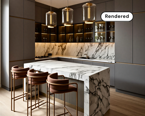 Create photorealistic kitchen, bedroom and bathroom renders in seconds with our AI KBB rendering software. No complexity. Just results.